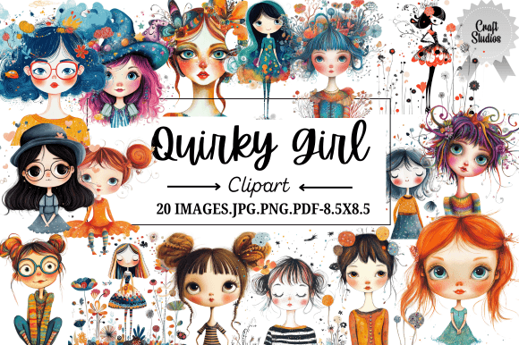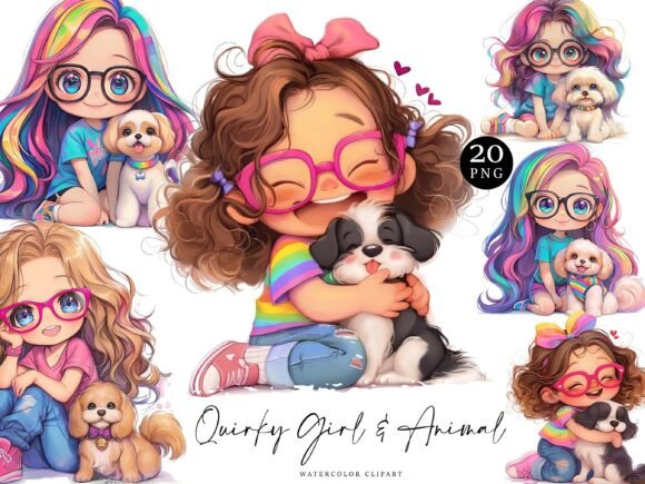 The vibrant, colorful style of these illustrations instantly catches your eye! Unlike typical clipart, these quirky girls with their rainbow hair, stylish glasses, and adorable puppy companions have this incredible personality and charm.