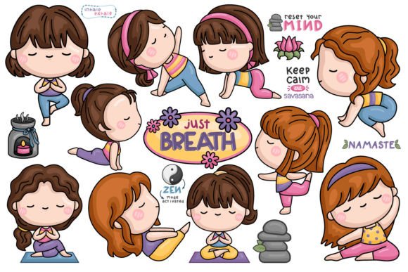 The variety in this collection is absolutely wonderful! From the girls in meditation poses with their hands in prayer position to the ones stretching in warrior pose – each character brings its own unique sense of calm and mindfulness. Phrases like “Just Breathe,” “Reset Your Mind,” and “Keep Calm” paired with the yoga poses create perfect little reminders for self-care practices.