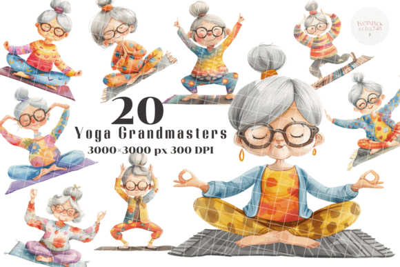 I stumbled upon this heartwarming collection of 20 Yoga Grandmasters illustrations while creating birthday cards for my aunt who recently started yoga in her seventies. What an incredible find! These joyful, active seniors with their colorful outfits, silver hair, and perfect yoga poses completely transformed my simple cards into something that made her laugh and feel inspired!